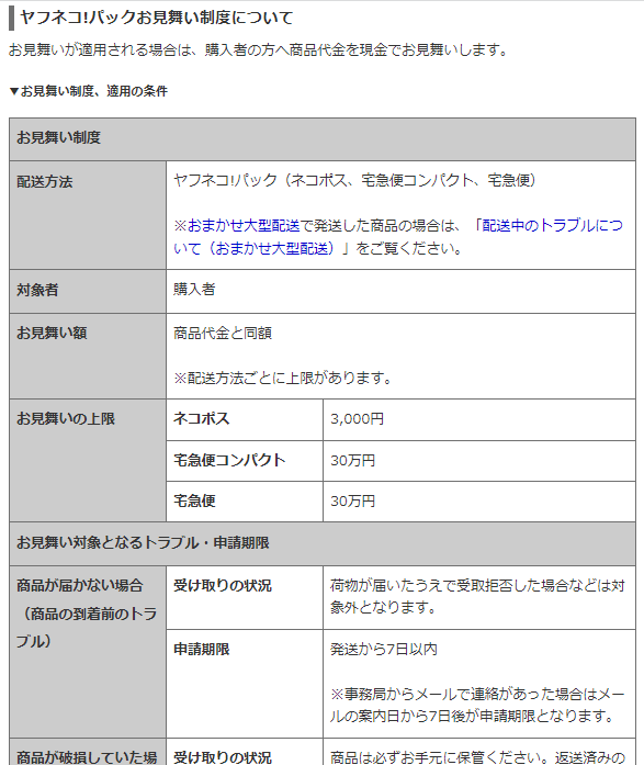 ヤフネコ!パック ネコポスのお見舞いは3,000円という上限があります。もっと高額な商品を送る際の心の平穏にはあえて宅急便や宅急便コンパクト(補償上限30万円)を使う必要があるかなあ、と思いました。
